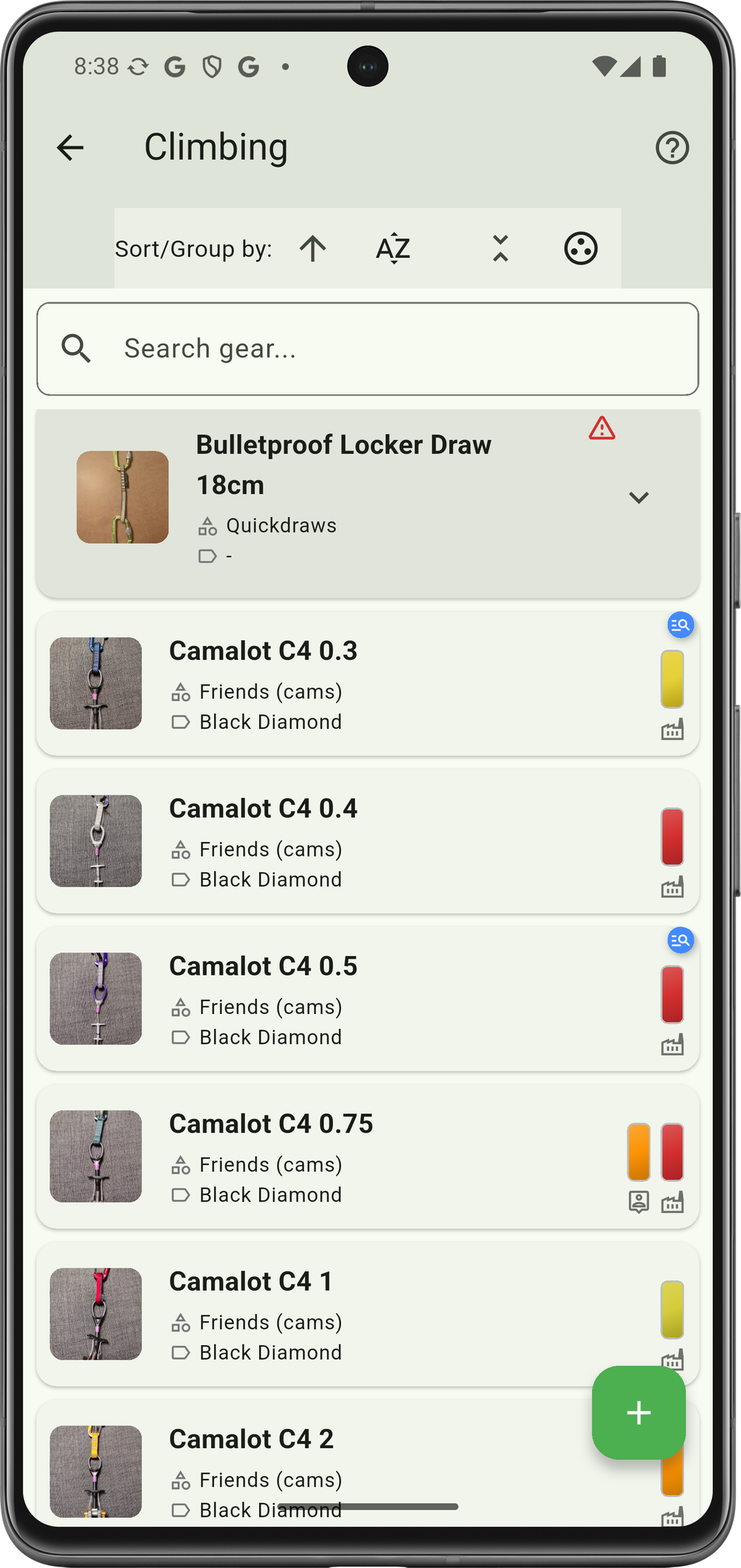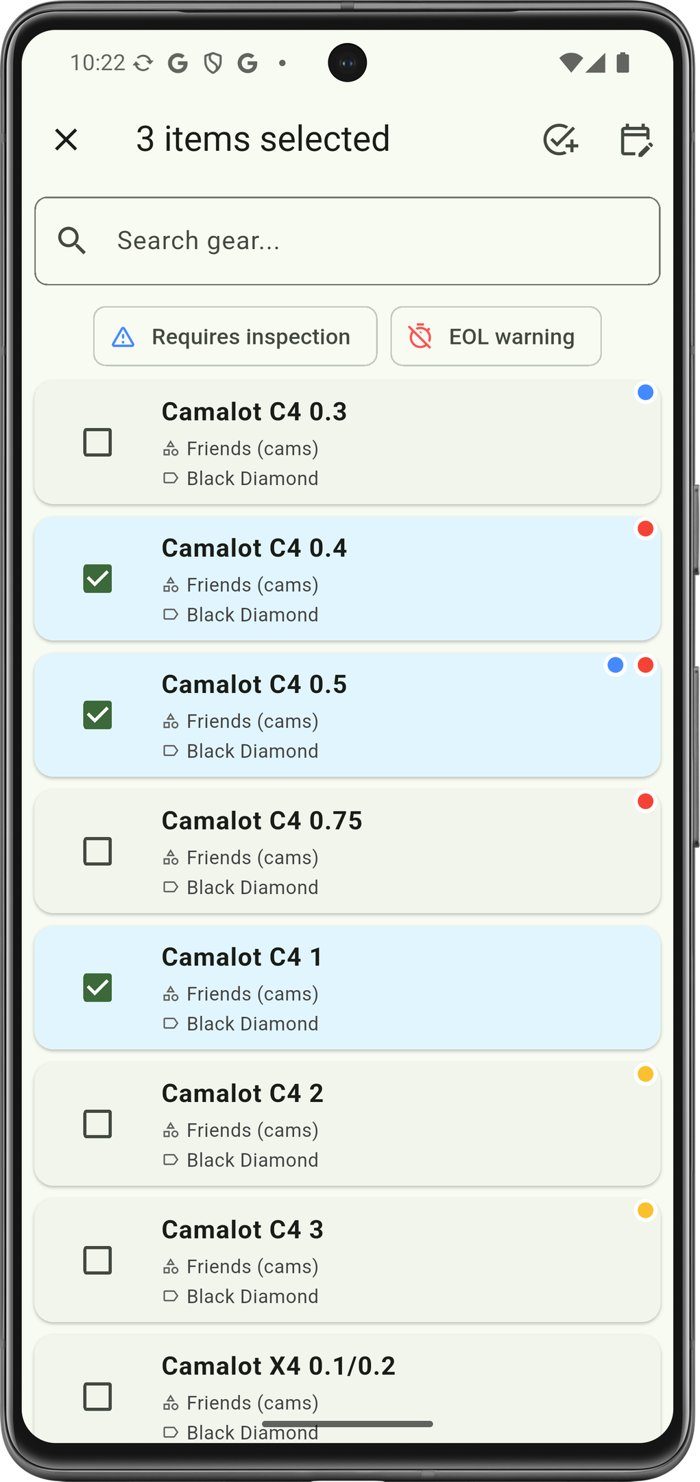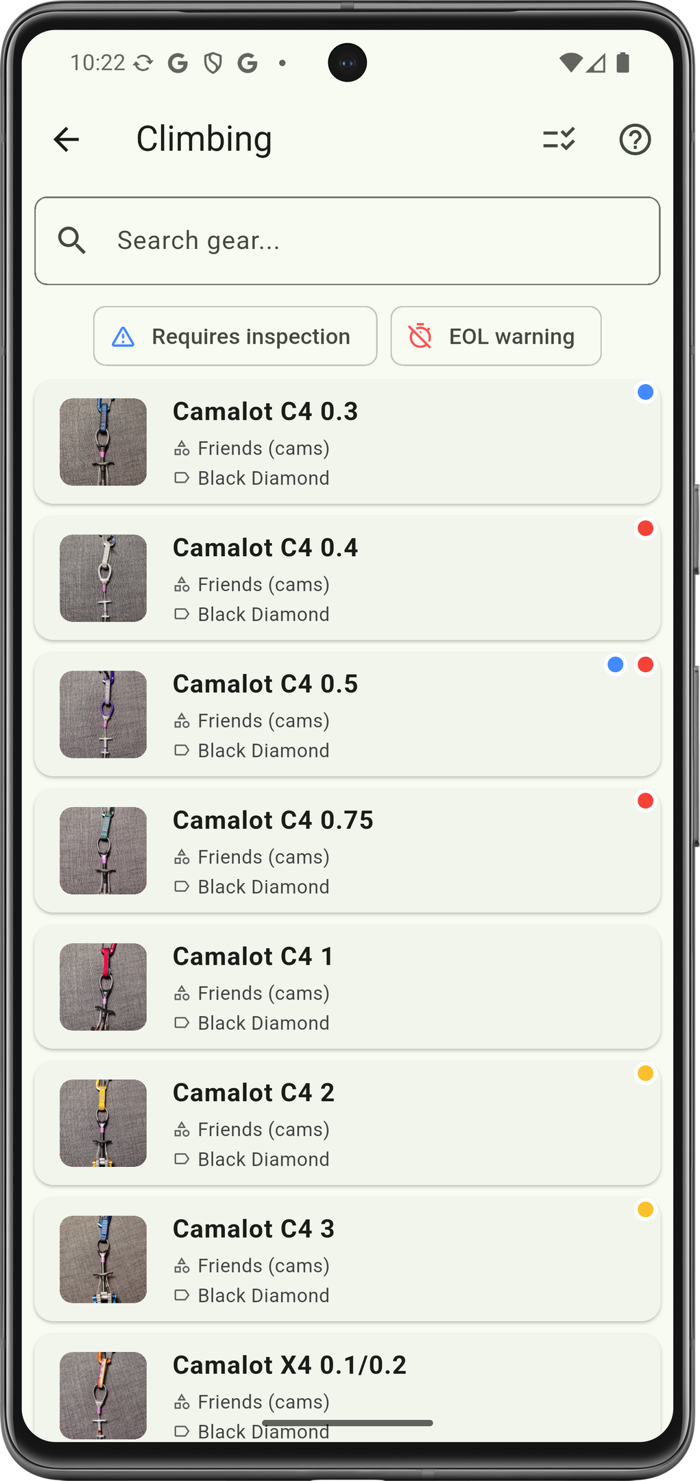 GearBase can keep track of End-of-Life and Inspections. If you choose to do so, the statuses are indicated by bars and symbols.