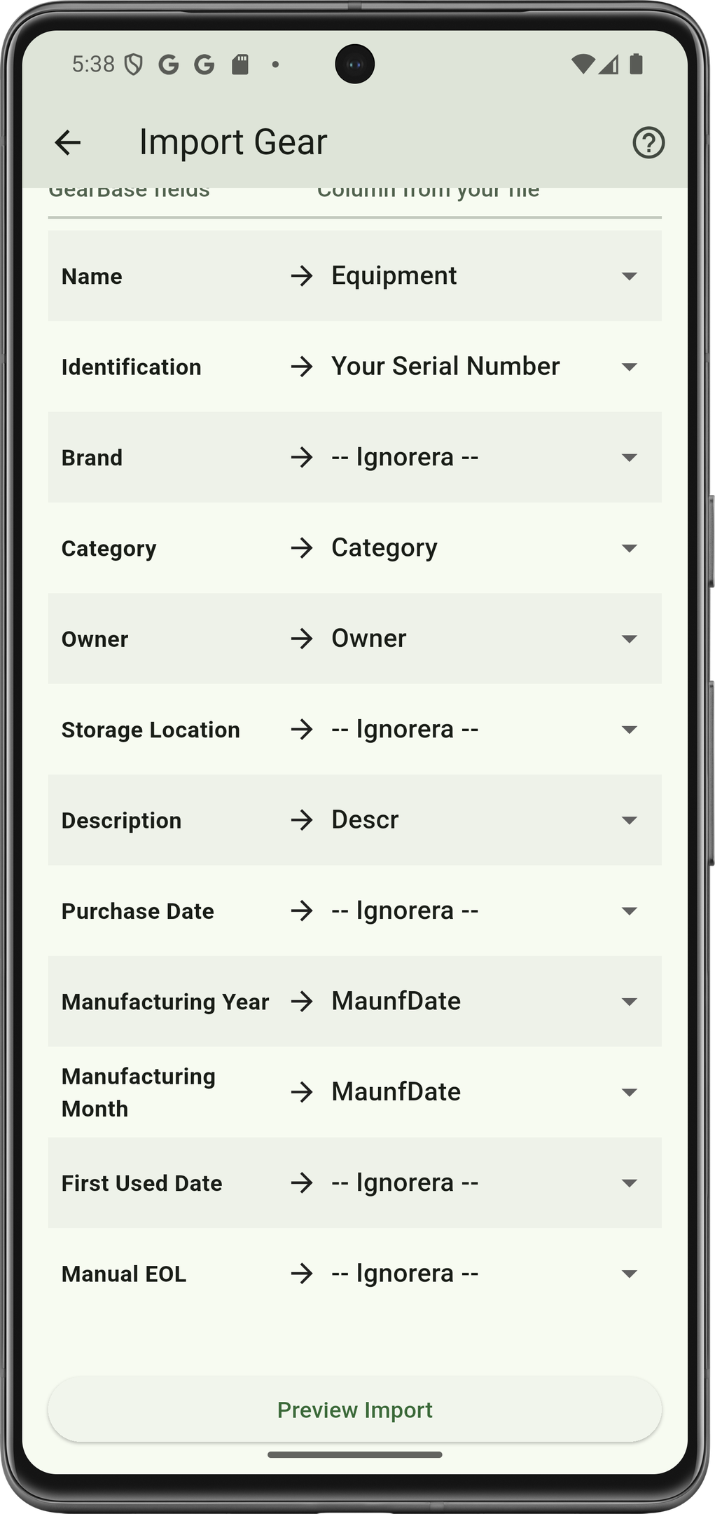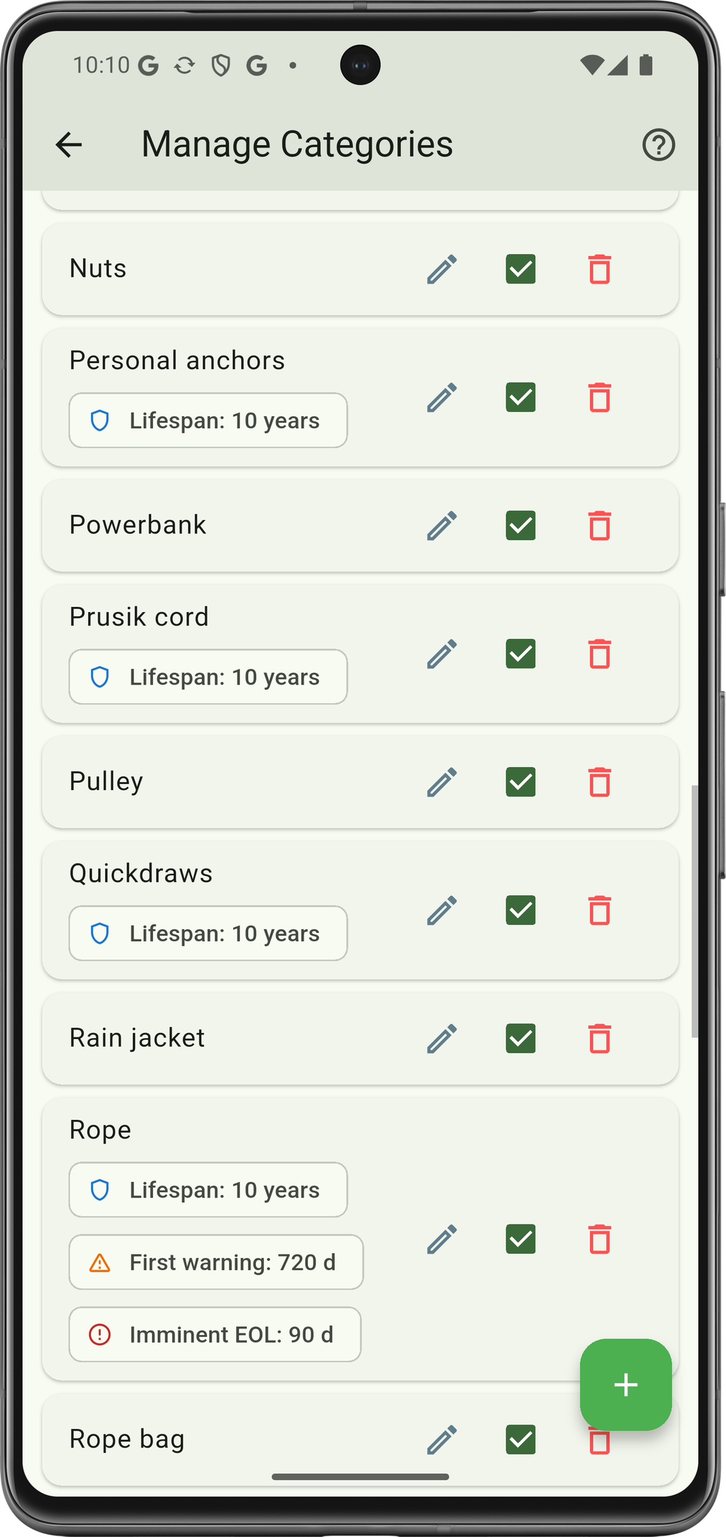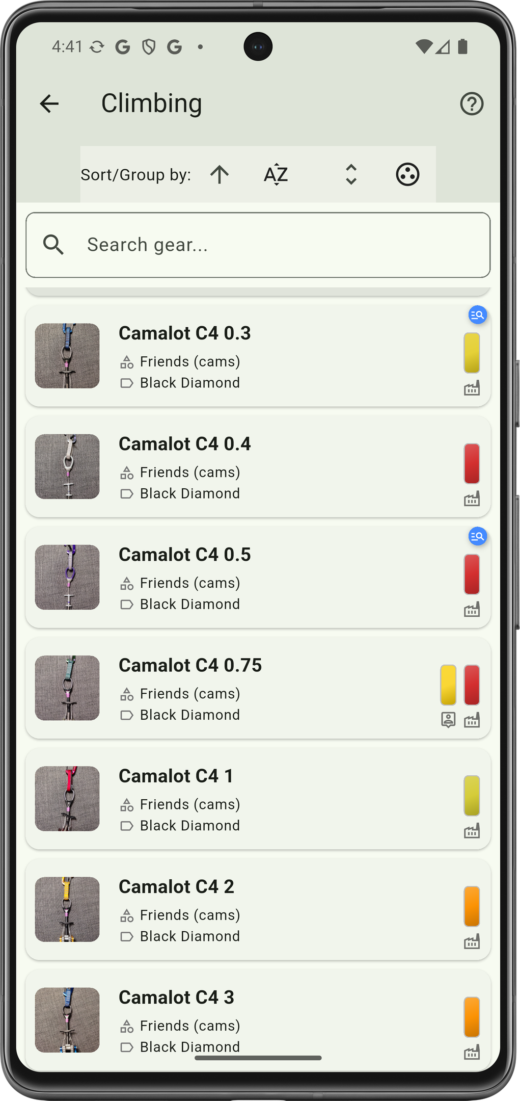 GearBase can keep track of End-of-Life and Inspections. If you choose to do so, the statuses are indicated by bars and symbols.