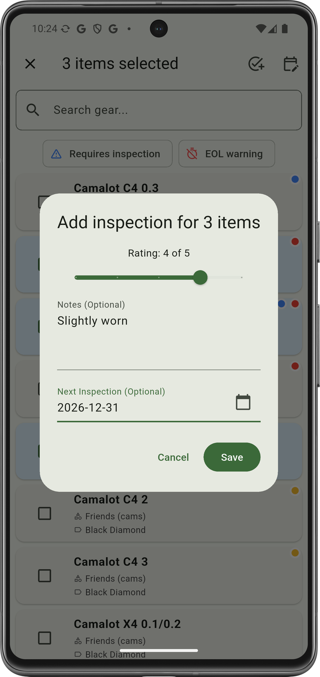 You can select one or more gears and either add inspection details to them or update the Next inspecion date.