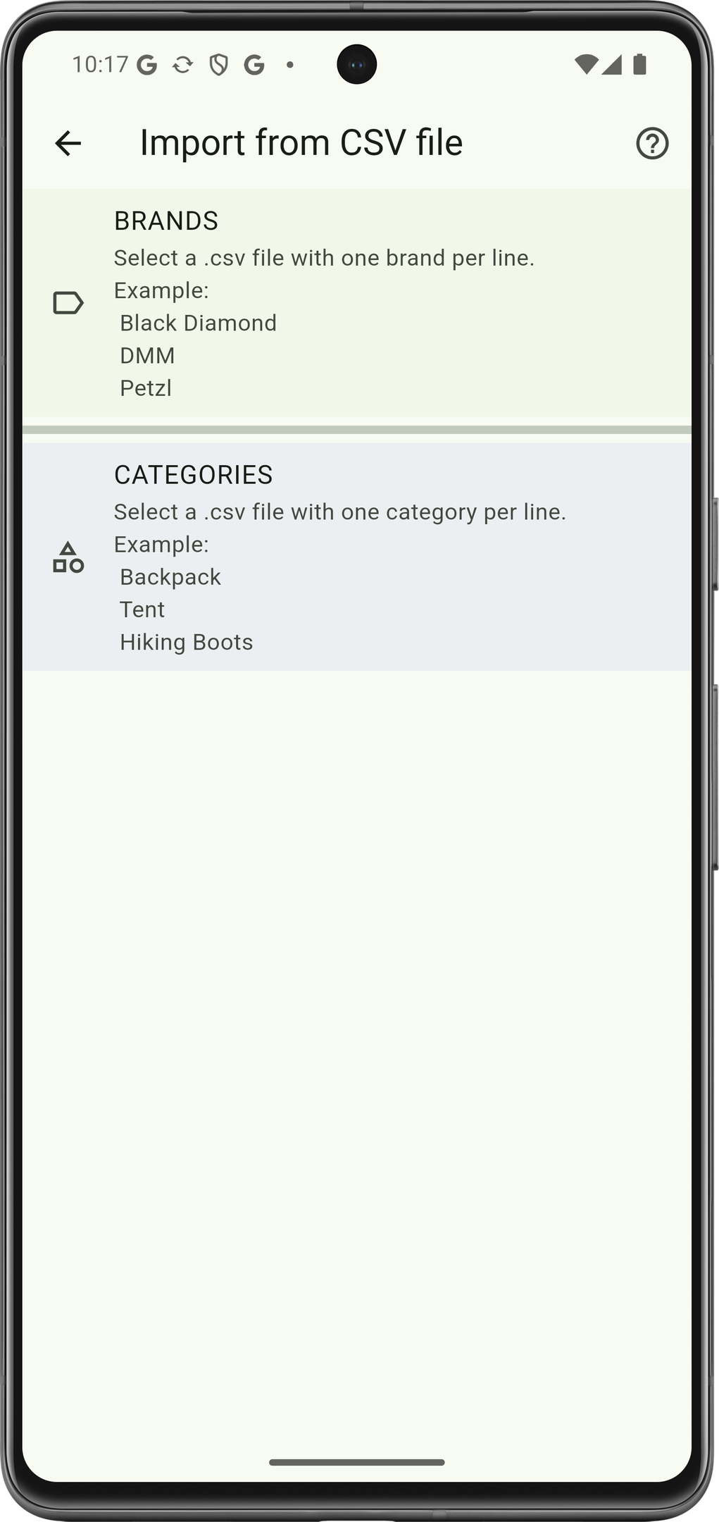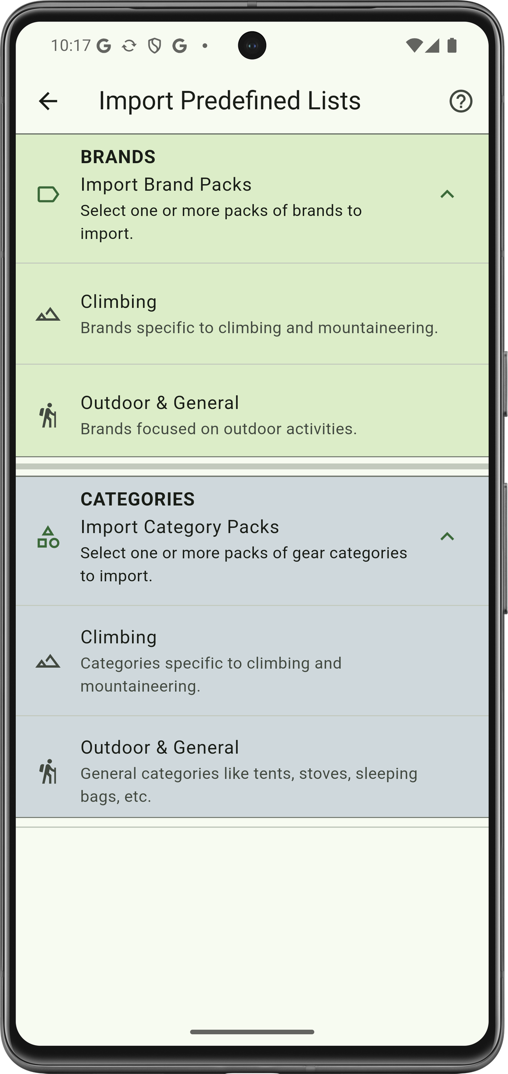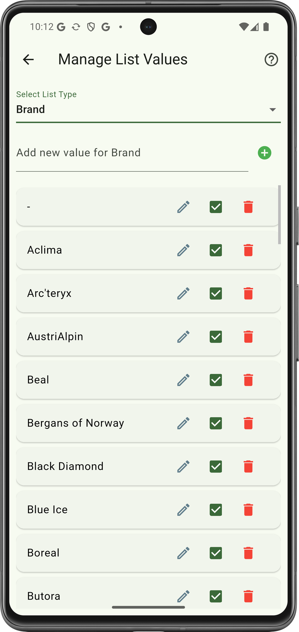The app includes predefined list with climbing and general outdoor brands and categories.