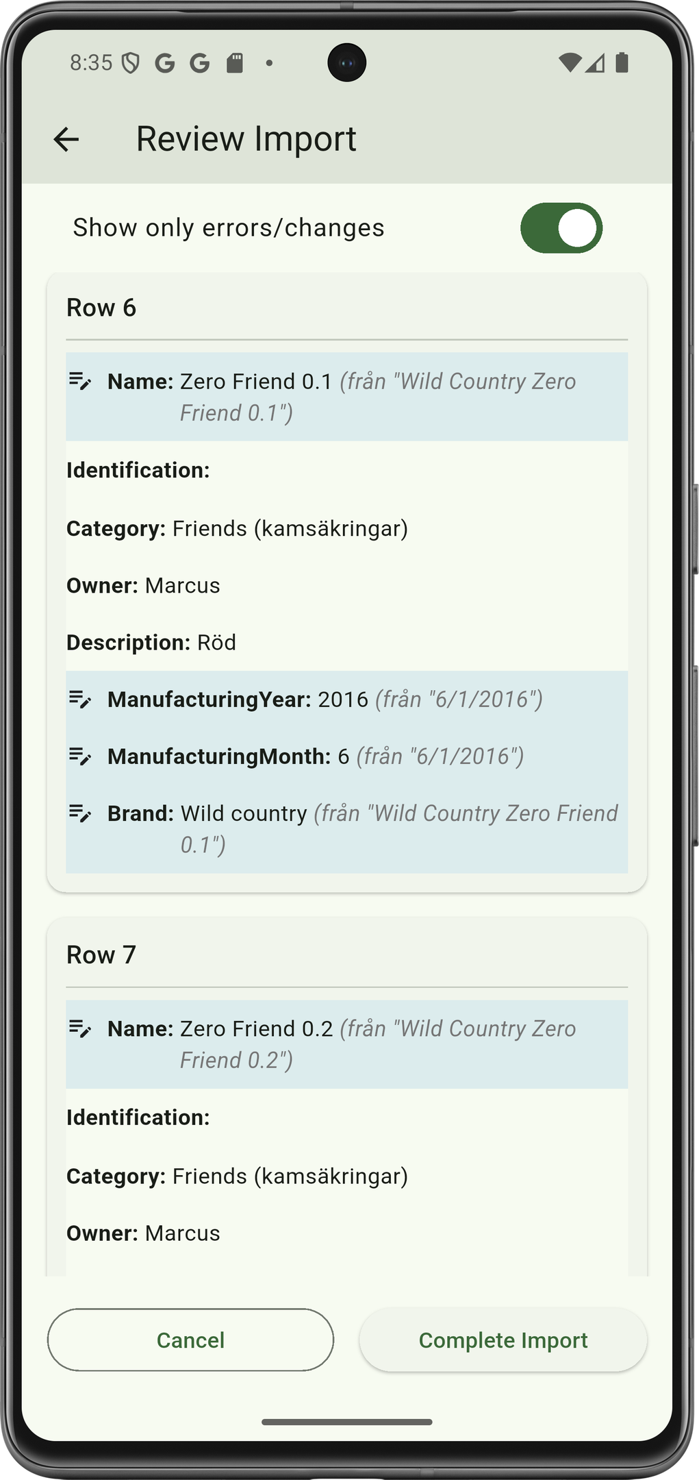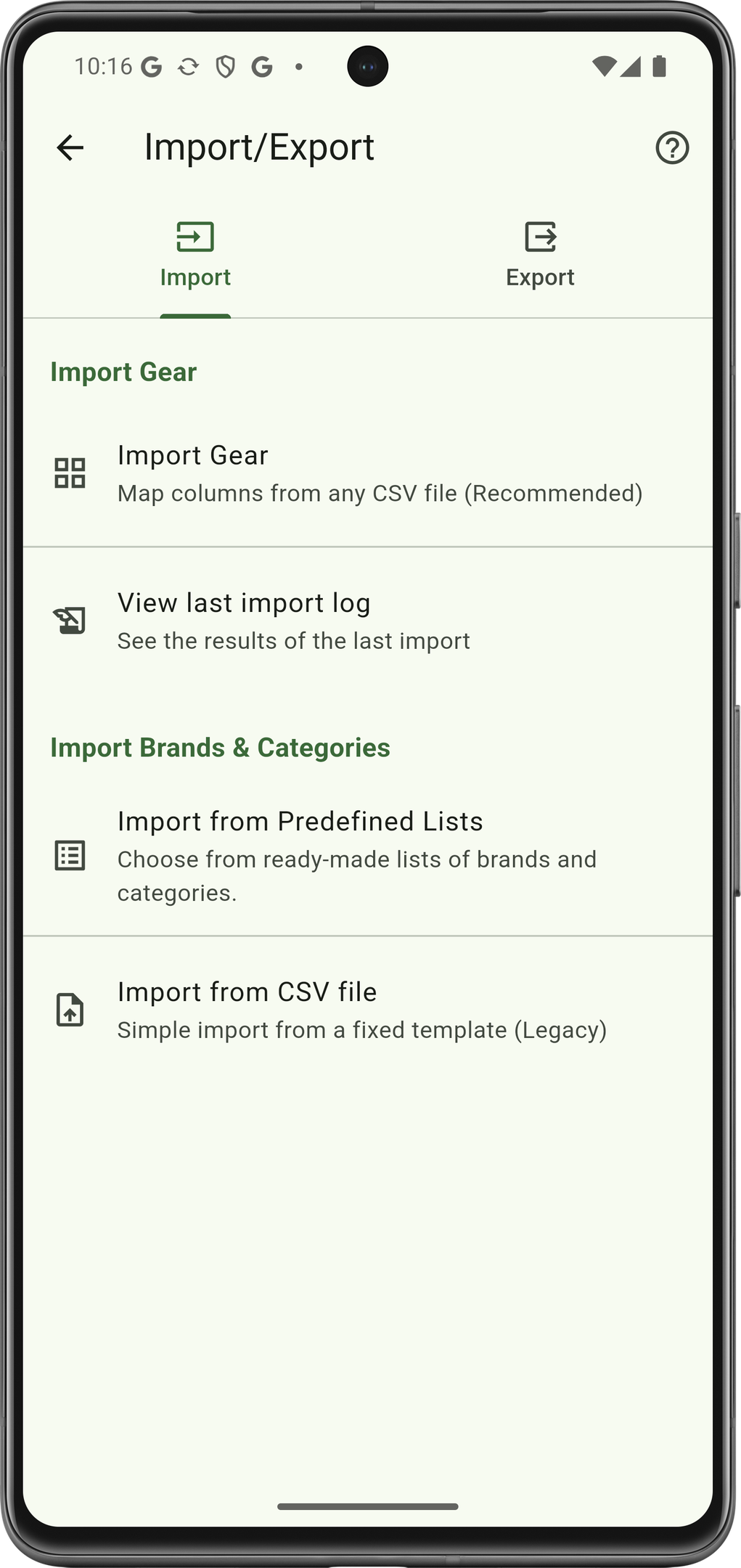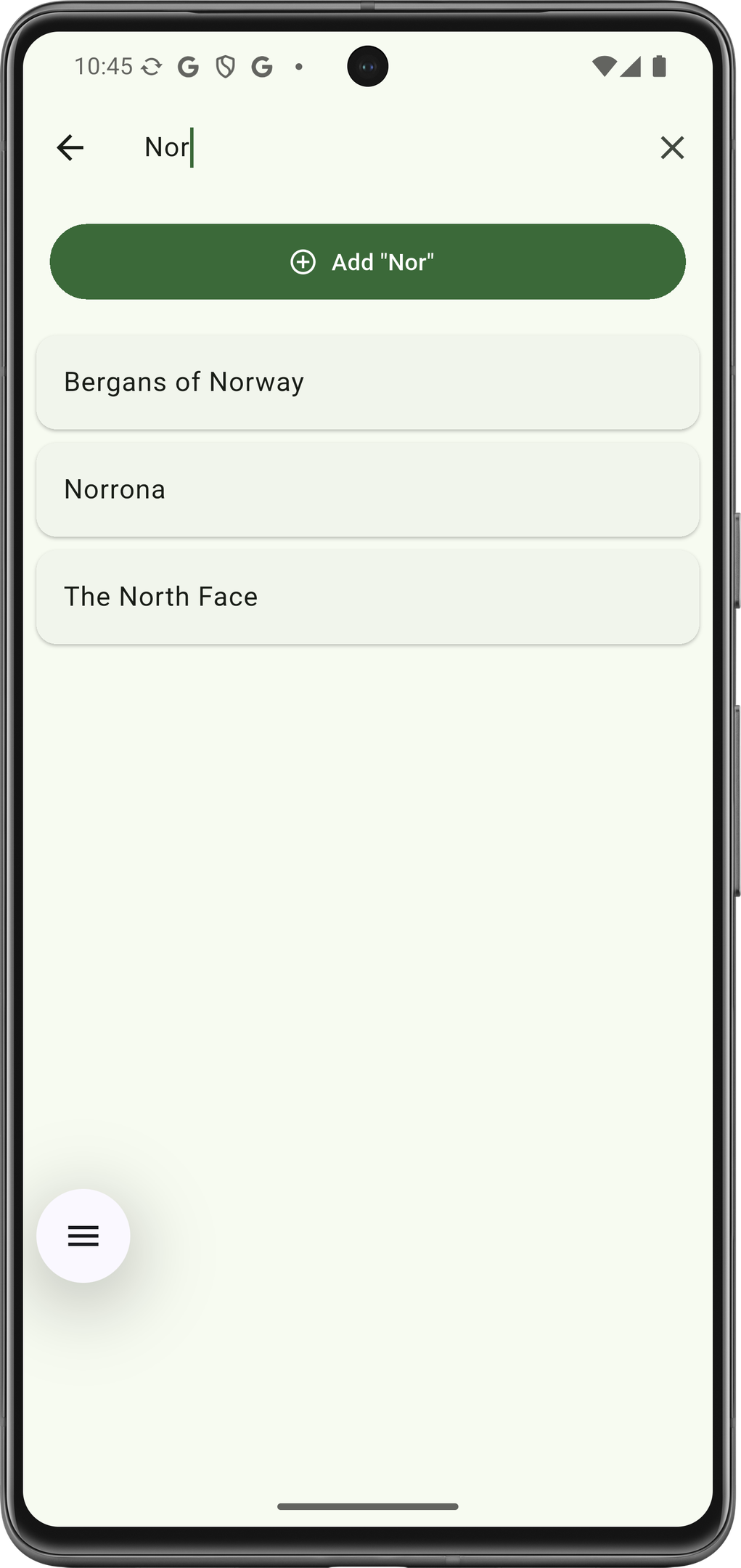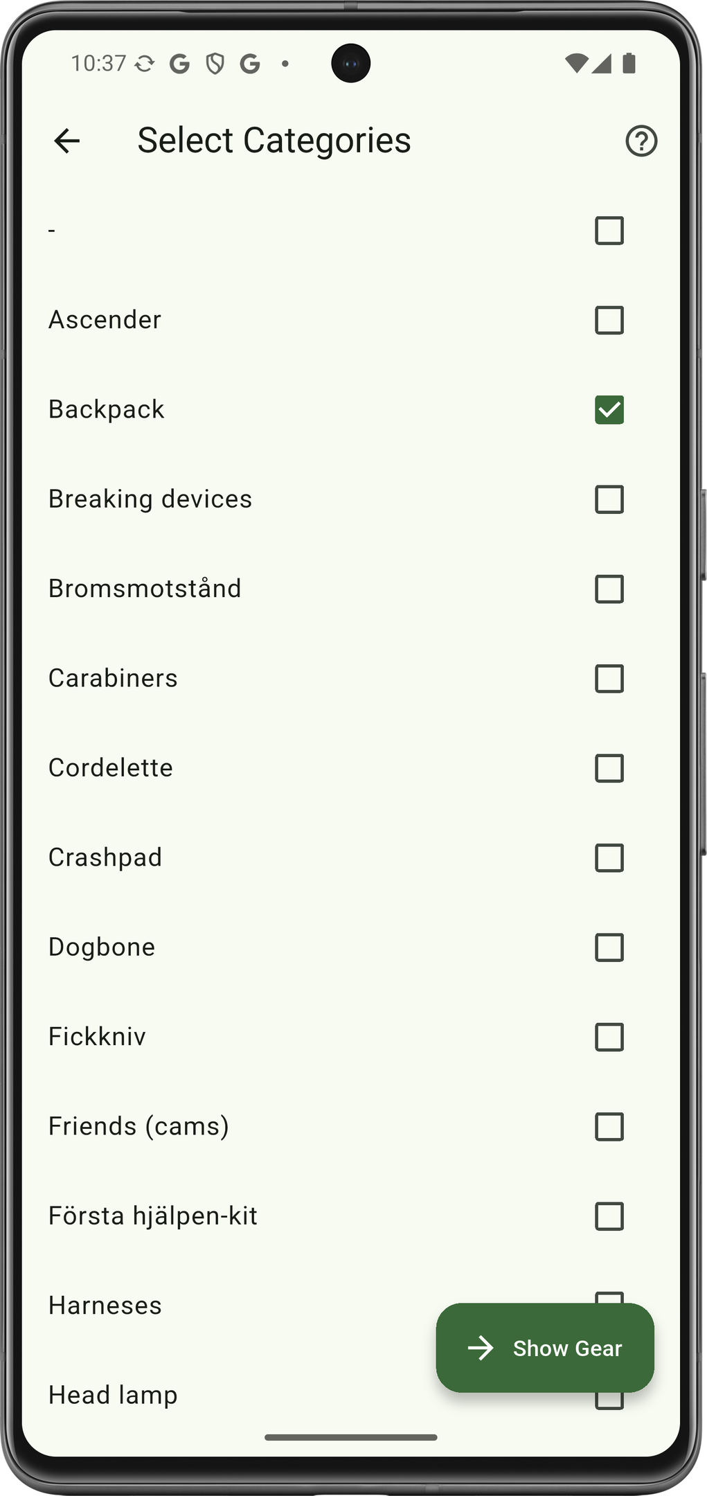 The app includes predefined list with climbing and general outdoor brands and categories.