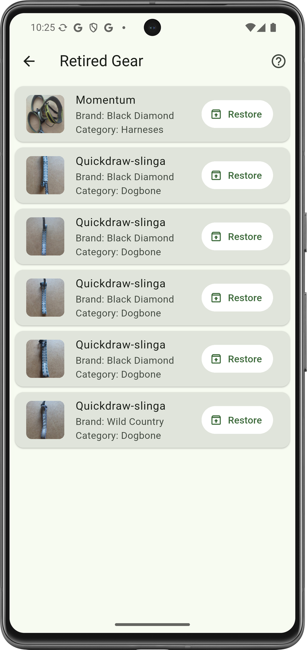 All retired gear can be accessed by the tool Retired gear. If something has been wrongfully retired or you want to reinstate it you can restore it here. After restoring a gear it will be visible in the normal gear list again.
