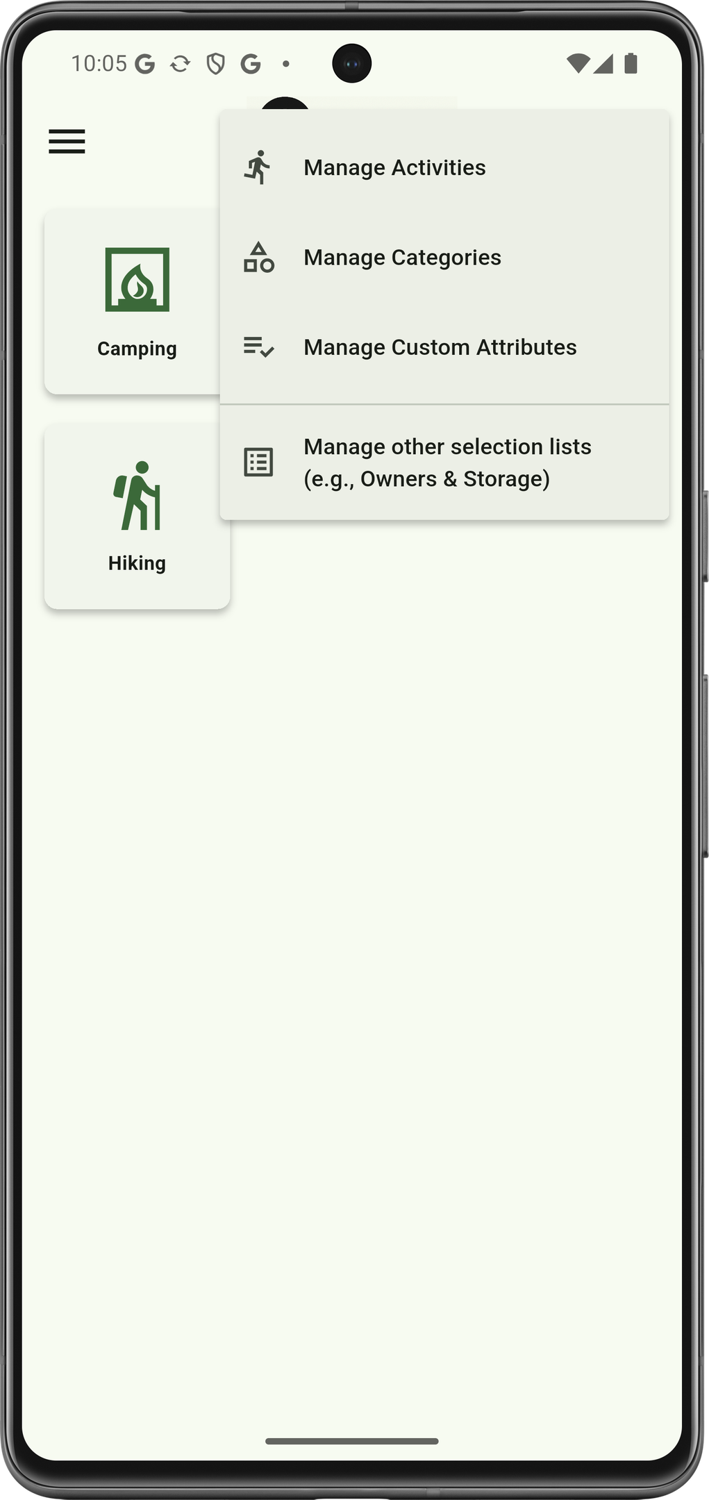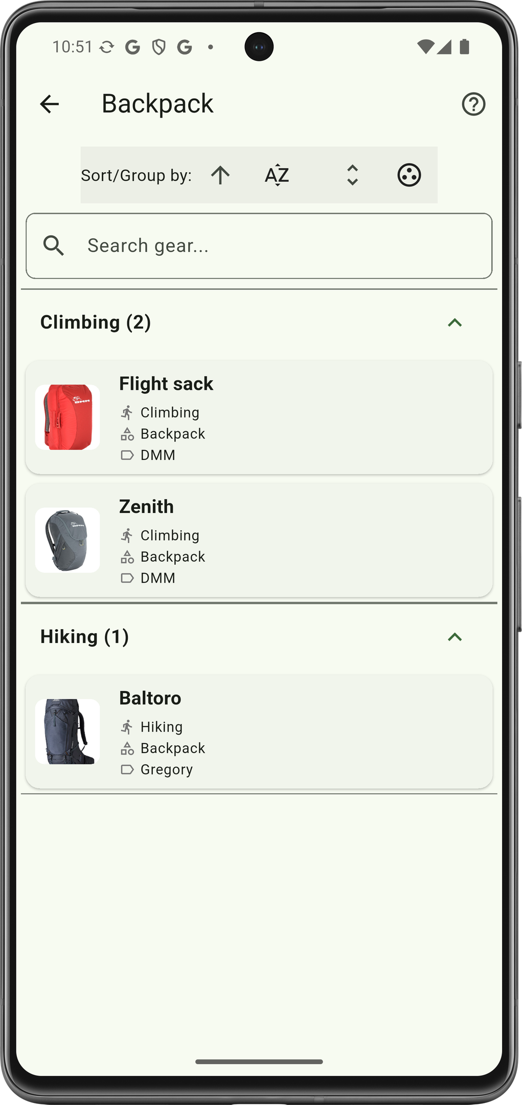 Group your gear into different activities. "Activities" can reallybe anything you want to have as a category.