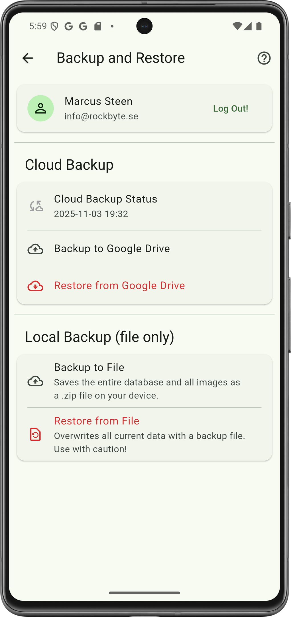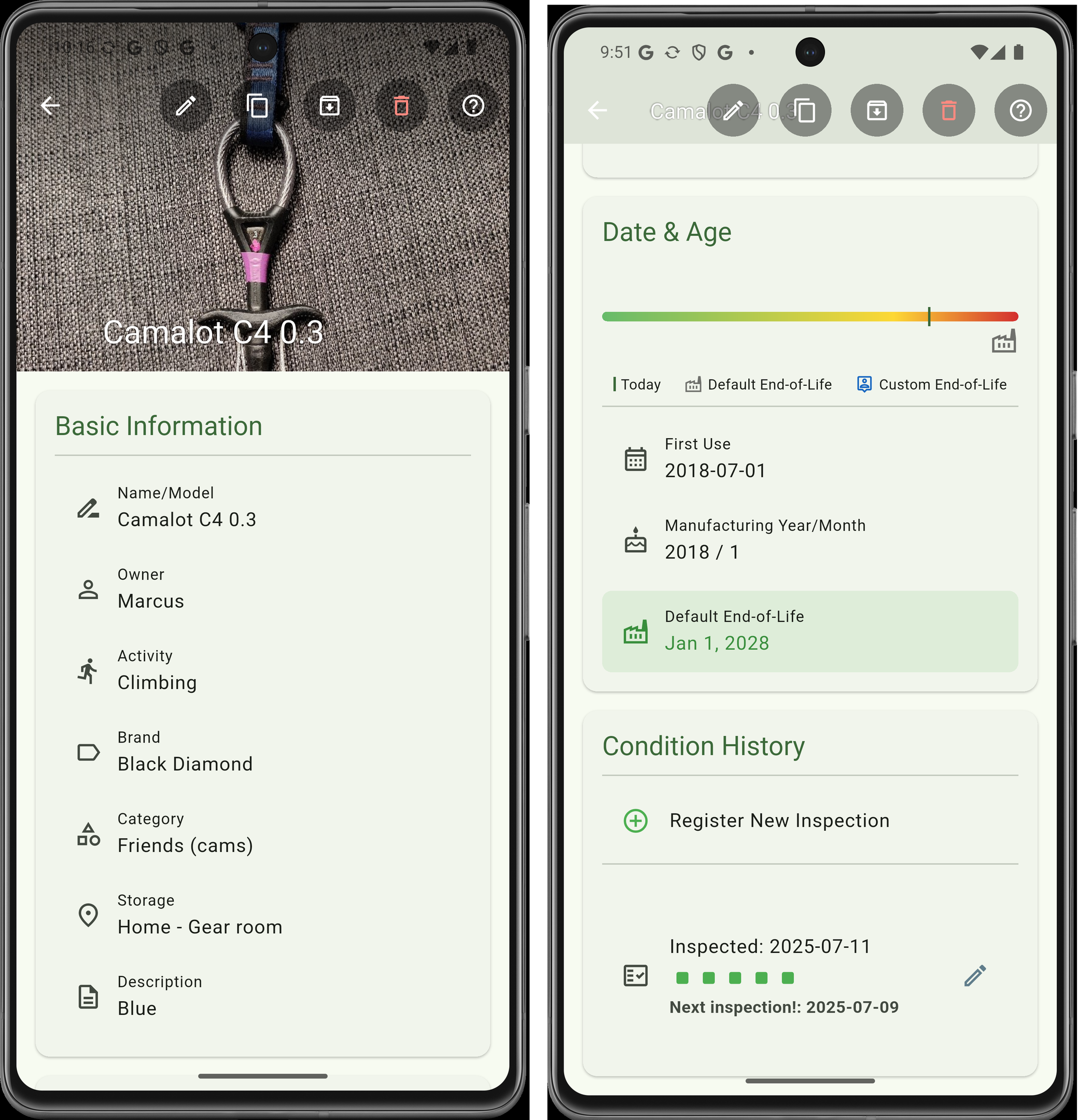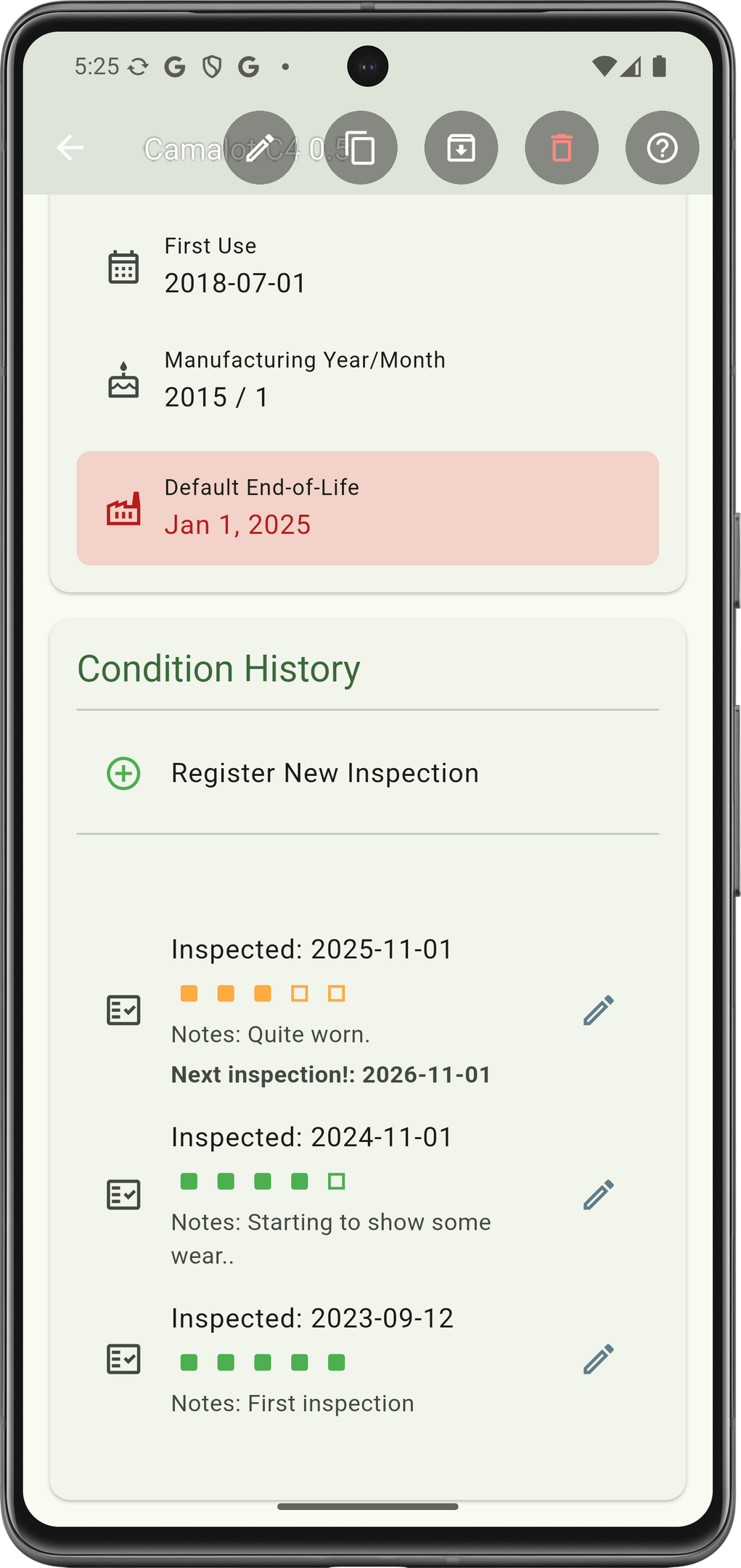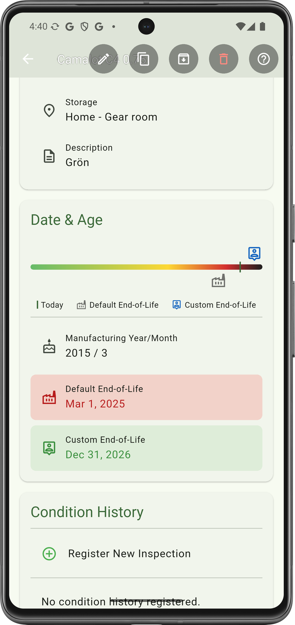 In the Detail page you see all information you have added, including a Lifespan timeline and inspection information if those features are used.