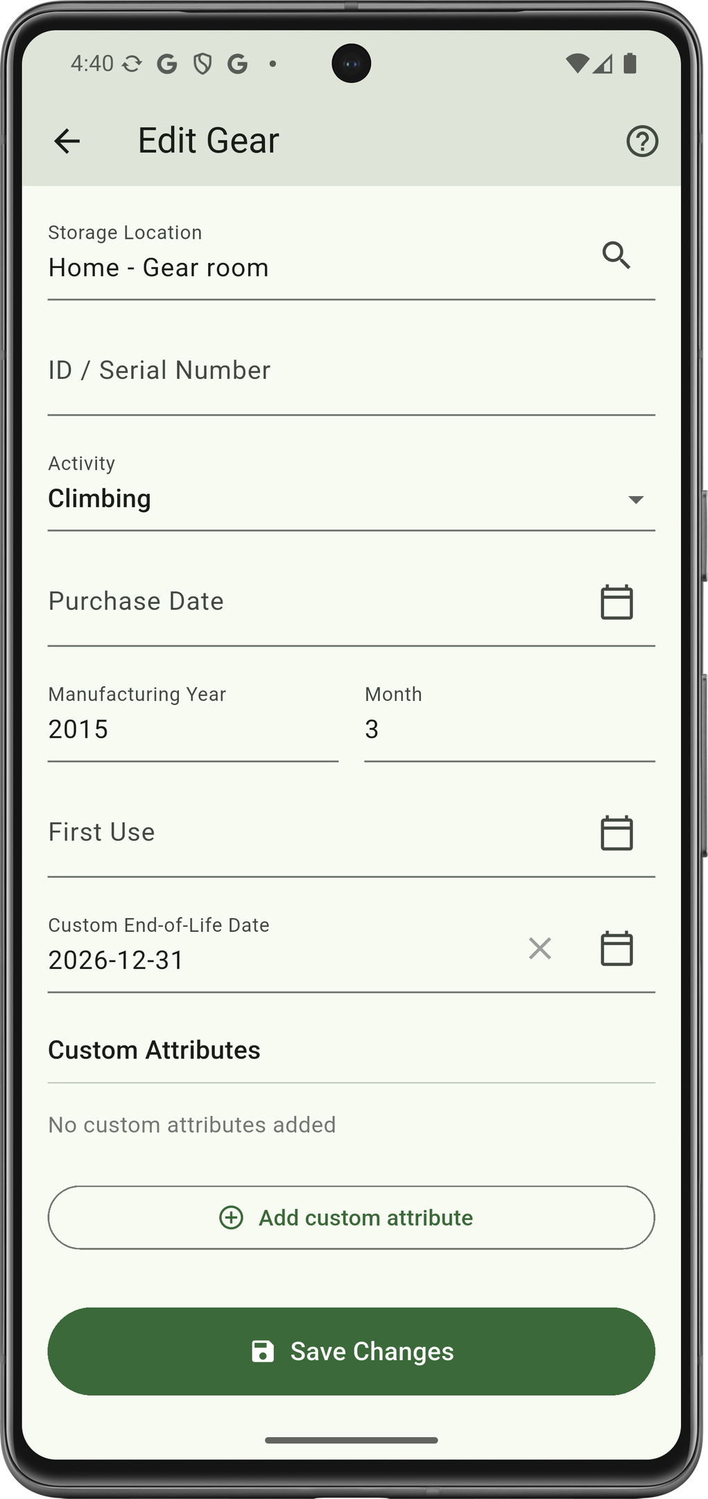 The End-of-life is then calculated based on the Lifespan value you have defined for that category of gear.
