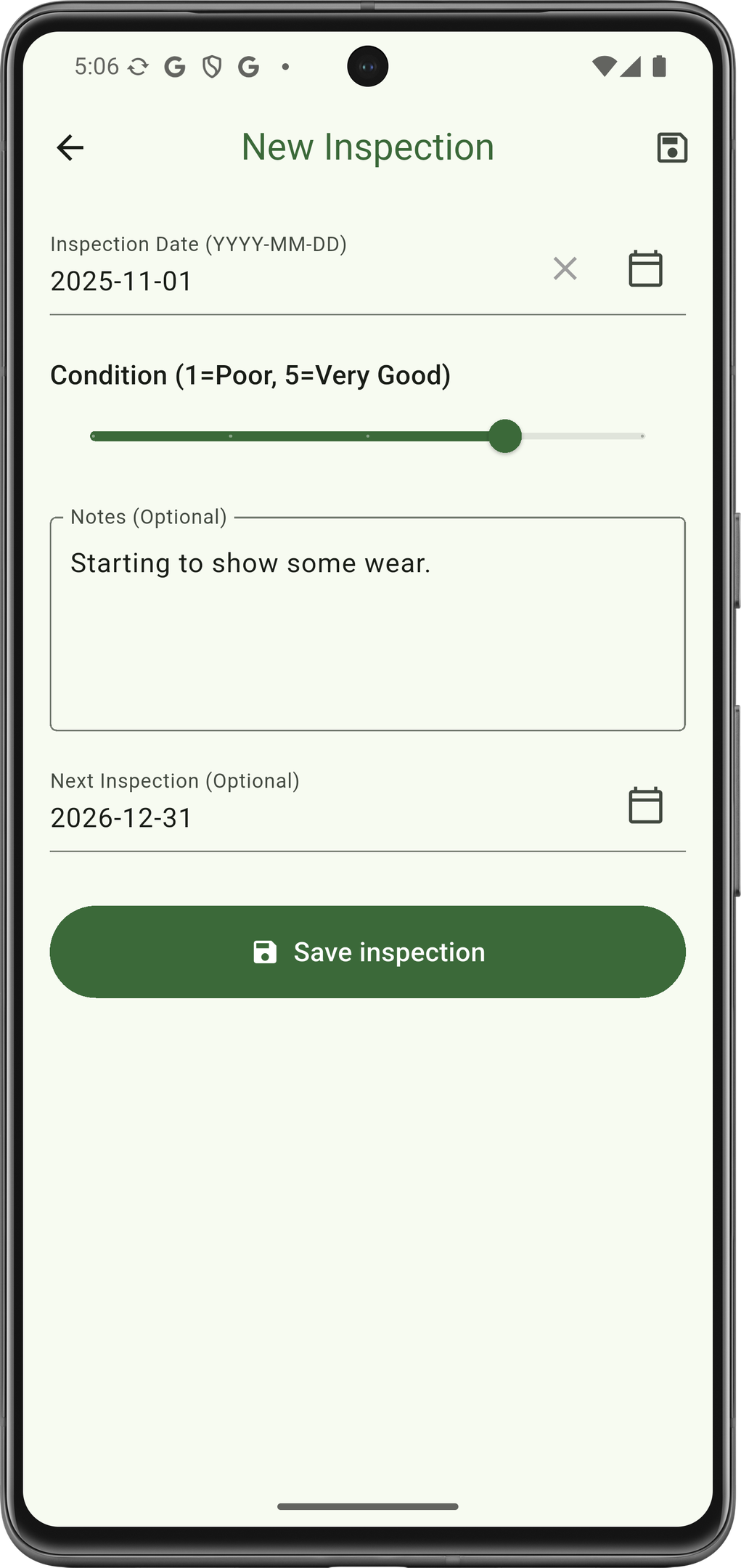 You can use the app to register inspections of critical equipment. Give a Condition rating, Notes and Next inspection date.