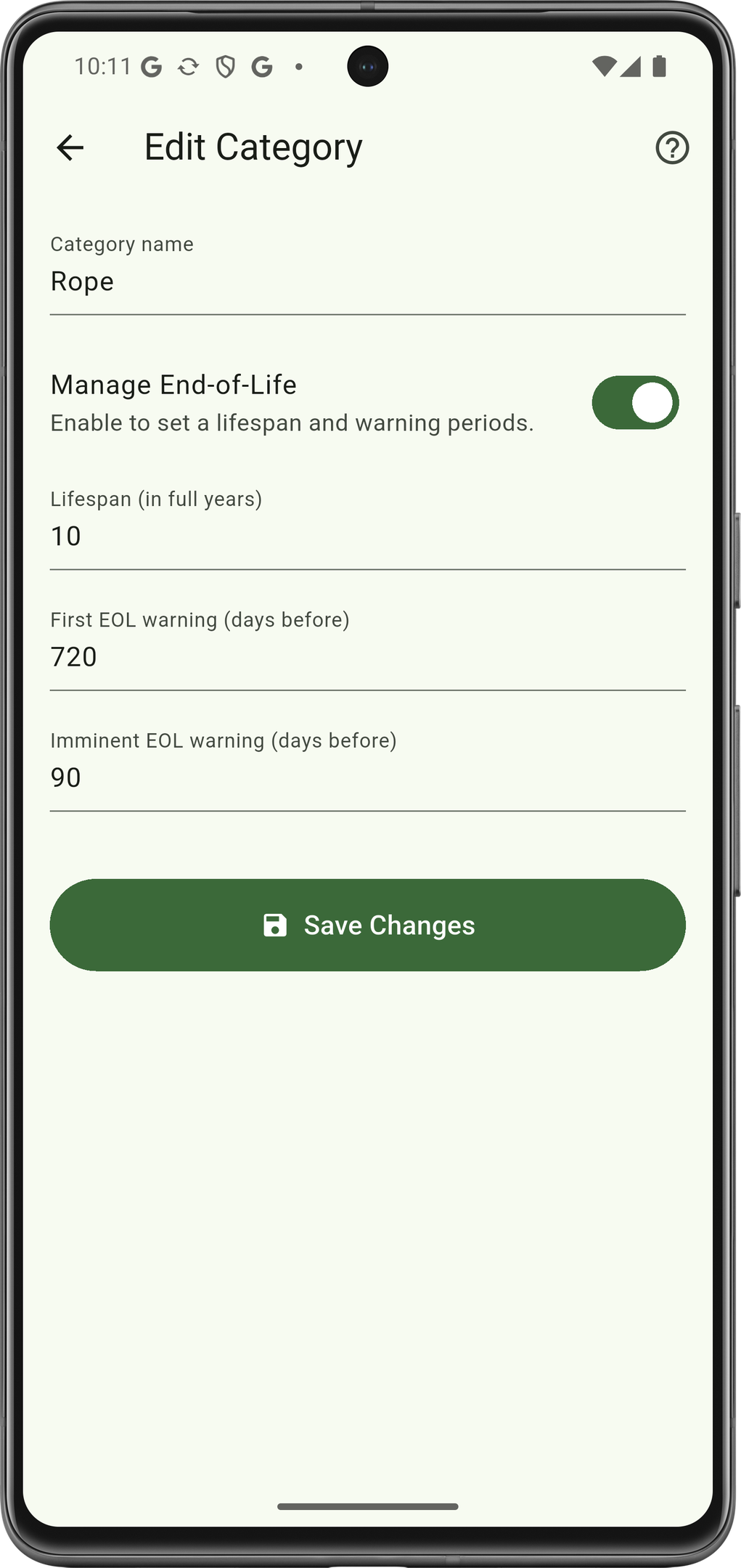 The End-of-life is then calculated based on the Lifespan value you have defined for that category of gear.